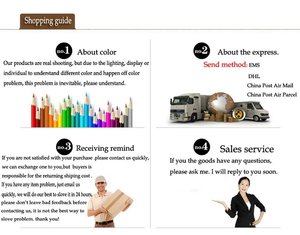 2. Hvis de produkter, du har modtaget blev beskadiget eller forkert stilarter, skal du ikke efterlade nogen negative tilbagemeldinger først, bedes du kontakte os, vil vi beskæftige os med det og udarbejde de bedste løsninger, Din tilfredshed er vores beslutning om at gøre det bedre.